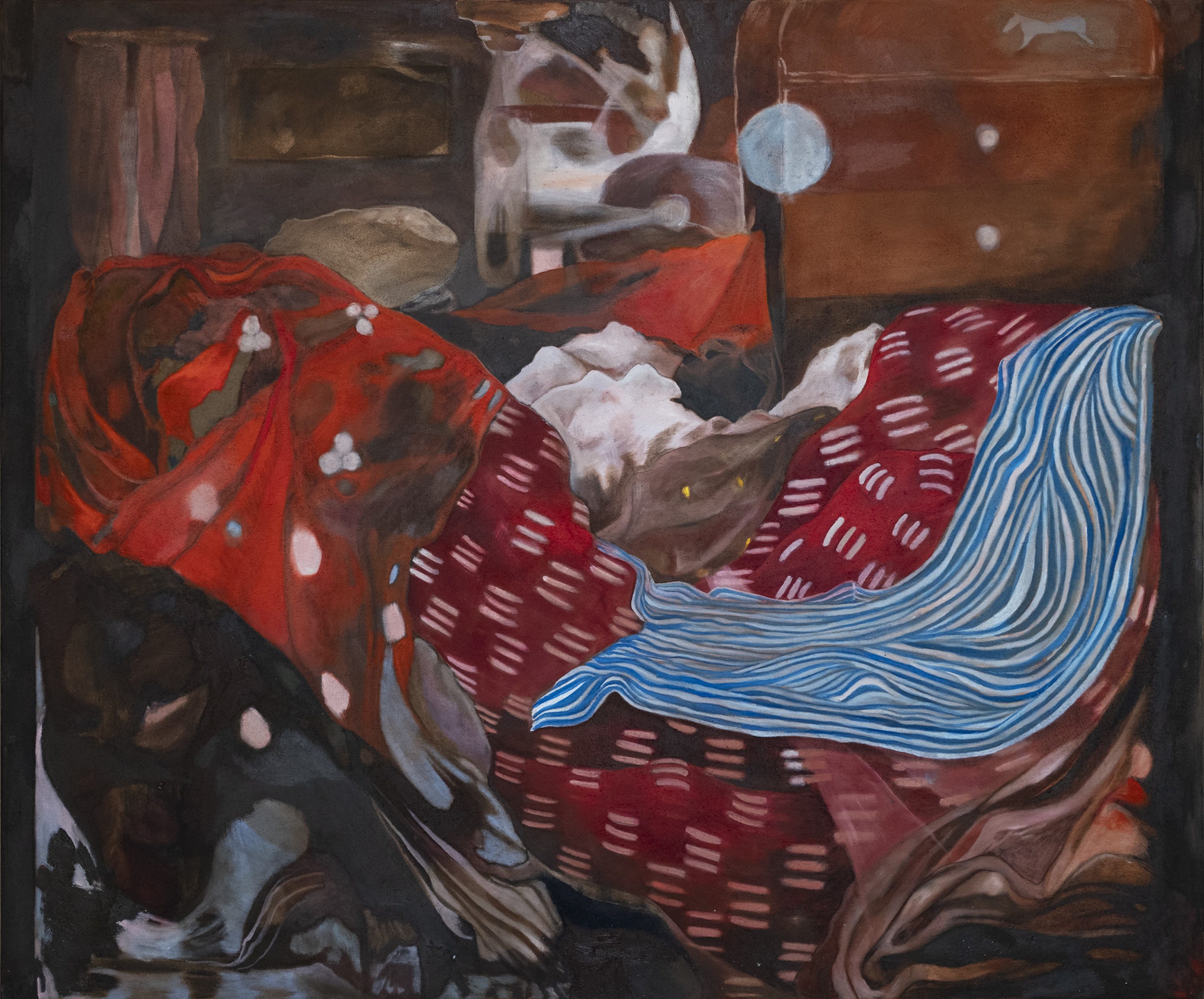 Oil on thinly stretched muslin. Transparent in some places. Temporary object (will eat itself).